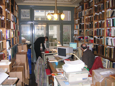 Manja Burgers, de eigenaresse van het antiquariaat, was zo vriendelijk mij toe te staan deze foto´s te nemen en hier op het weblog te publiceren. Als dank heb ik op de website www.benedictusdespinoza.nl een link naar het antiquariaat geplaatst. Intussen maakte ik graag wat meer foto´s van deze sfeervolle omgeving van niet alleen meer antiquarische boeken, maar – wat Spinozana betreft – ook nieuwe boeken, waaronder  veel buitenlandse. Met het antiquariaat werd in 1967 begonnen. In het begin ging het  vooral om judaica. Later kwam Spinoza erbij als aparte specialisatie, waarna een paar jaar geleden werd besloten om Spinoza´s naam aan het antiquariaat te verbinden.