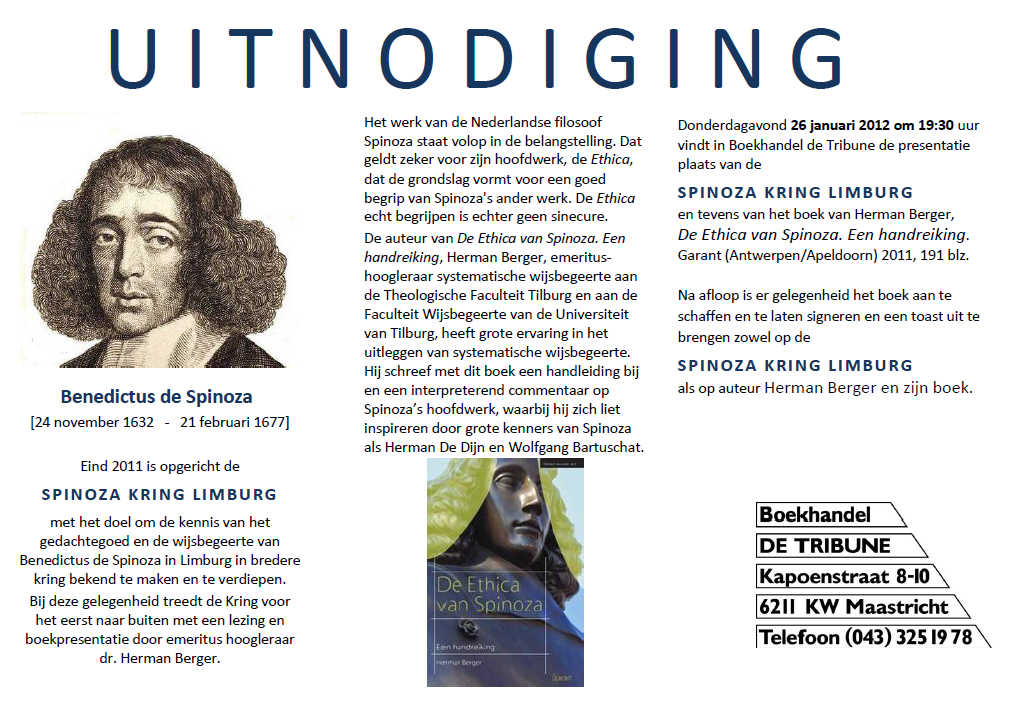 Op donderdagavond 26 januari 2012 om 19:30 uur vindt in Boekhandel de Tribune te Maastricht de presentatie plaats van de SPINOZA KRING LIMBURG en tevens van het boek van Herman Berger, De Ethica van Spinoza. Een handreiking [Garant, Antwerpen/Apeldoorn, 2011, 191 blz.]. Toegang: gratis.