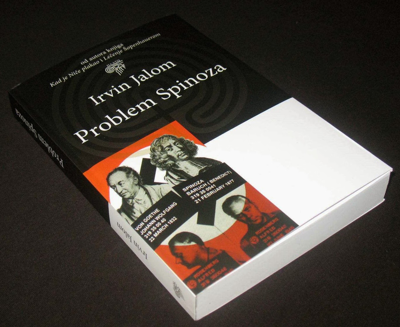 Dat ik hier een blog maak over Irvin D. Yalom heeft uiteraard alles te maken met zijn boek The Spinoza Problem. Vanwege z'n Nietzsches tranen had ik erg naar het boek uitgezien. Ik vond het wel interessant om de vertalingen een beetje te volgen – de covers hield ik in dit blog bij ook lang nadat mij het boek, vertaald als Het raadsel Spinoza, enigszins tegengevallen was [cf. blog], maar ik bleef covers tegenkomen, onlangs nog deze Bosnische [van hier]: