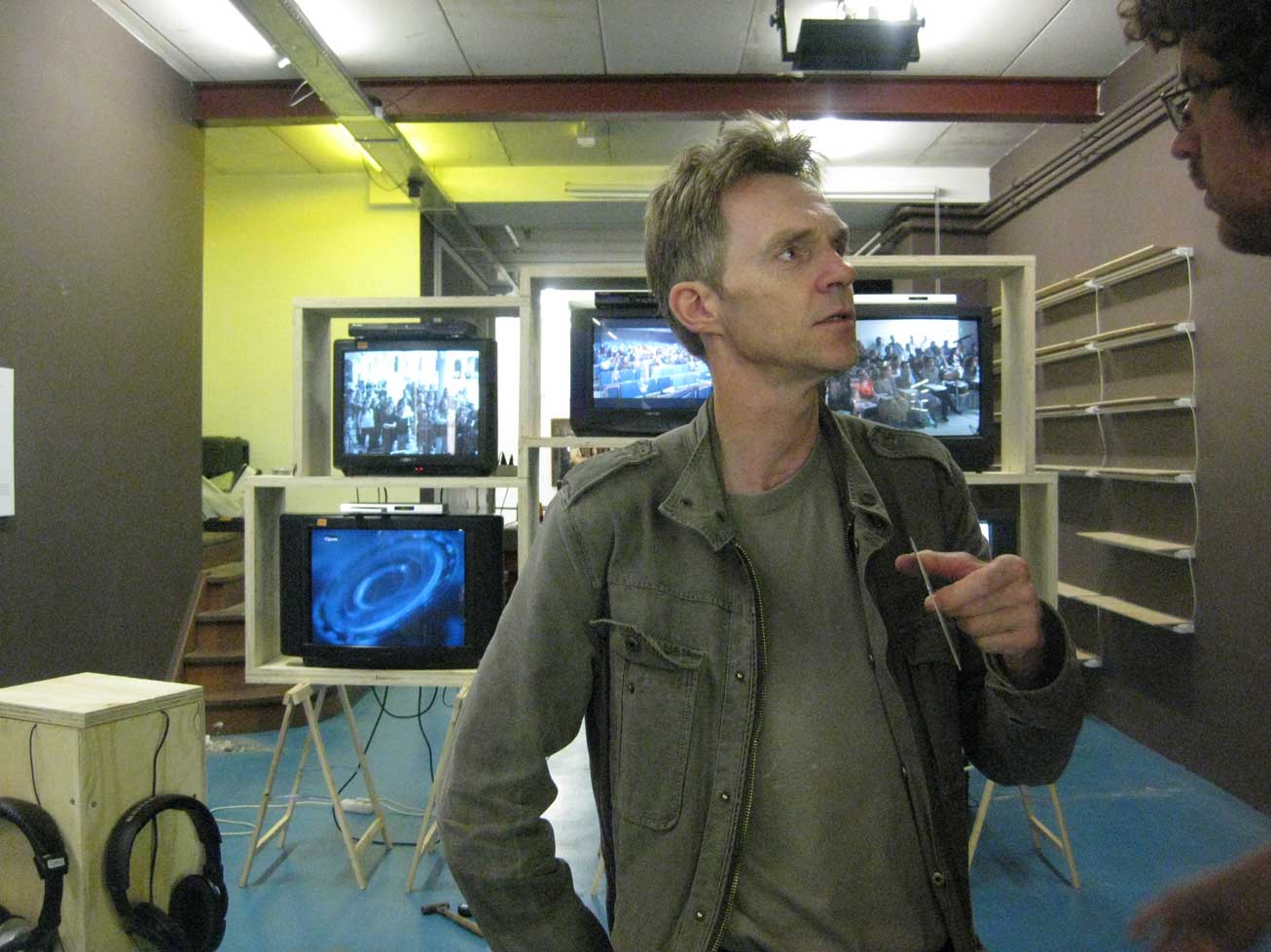 Of hij er al gereed mee is? Ik heb het niet kunnen vinden. Wel was er in het kader van de Amsterdamse Spinoza-manifestatie My Name is Spinoza vorig jaar (van 29 aug. tot 4 oktober 2009) in W139 al iets van te zien in Mondial Reading Performance, Half-time, waaruit hier een foto: