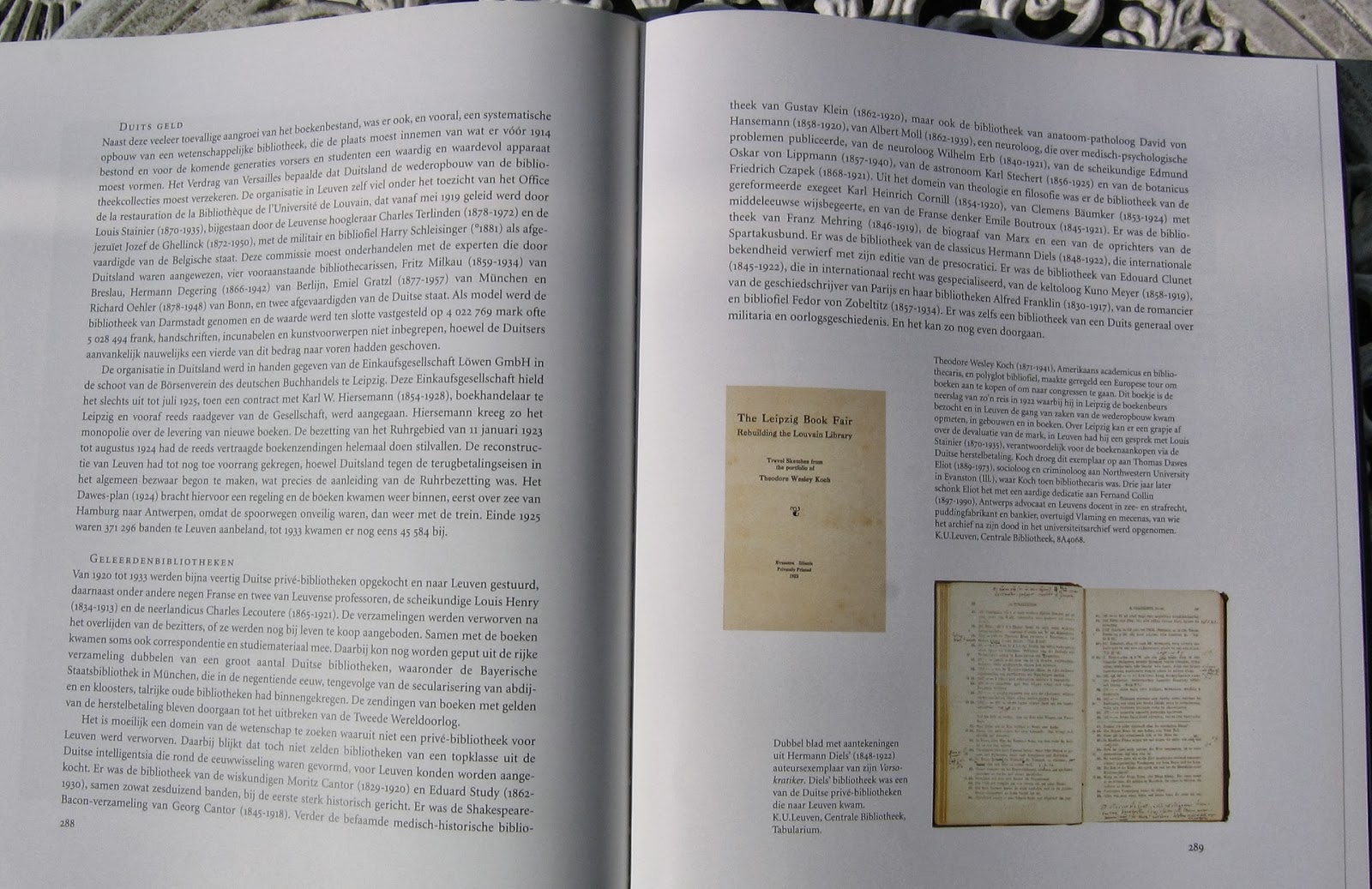 En wat blijkt? Er is in dit boek helemaal niets te vinden over deze Spinoza-bibliotheek! Wel uiteraard is er uitvoerige informatie over Artikel 247 van het Verdrag van Versailles, waarin Duitsland verplicht werd de Leuvense universiteit schadeloos te stellen voor de verloren handschriften, incunabelen en boeken. Er wordt verteld over hoe met het Duitse geld van 1920 tot 1923 bijna veertig Duitse 'geleerdenbibliotheken' werden opgekocht, daarvan werden een 19-tal voorbeelden gegeven (zie de afbeelding hieronder van die pagina's). Maar niets wordt vermeld over de Freudenthal-Brunner Spinoza-bibliotheek. Ik vrees dat ik dit volkomen negeren veelzeggend moet vinden. Ik vrees dat de heer Coppens er geen enkel belang aan hechtte en er daarom in zijn eigen boek niets over vermeldde.
