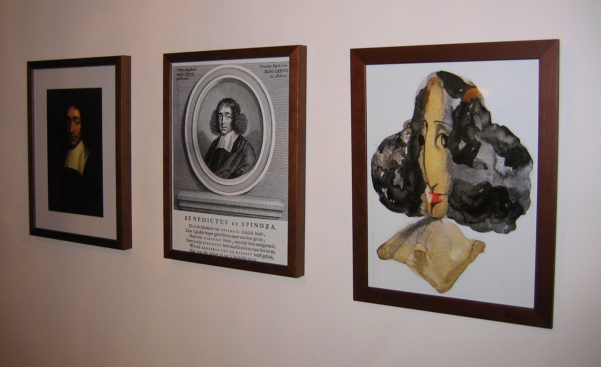 De lijstjes horen, gezien de afmetingen, niet echt bij elkaar, maar ik heb deze foto even gemaakt om te laten zien dat het lukt om de Spinoza-cartoon van Agustin Sciammarella, die ik op Nieuwjaarsdag bracht, naar A3-formaat 'op te blazen'.