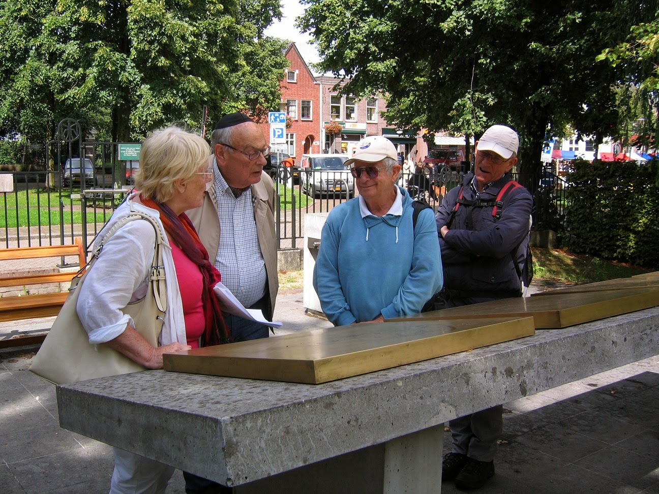De volgende halteplaats vormde de Sefardisch-joodse begraafplaats Beth Haim in Ouderkerk a/d Amstel. Hij was pas na wat omtrekkende bewegingen te bereiken, want 't Kampje (Kerkstraat e.o.) was afgesloten vanwege een zgn. Pure Markt, waarbij ook brandweer, politie en ambulance zich presenteerden. Maar we bereikten de ingang waar de mannen die geen hoofddeksel hadden meegenomen een keppeltje konden vinden.